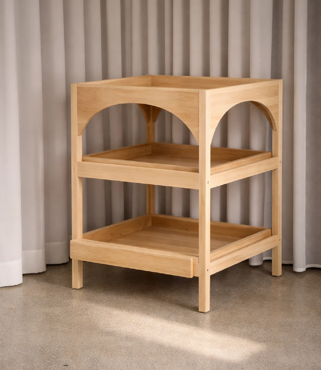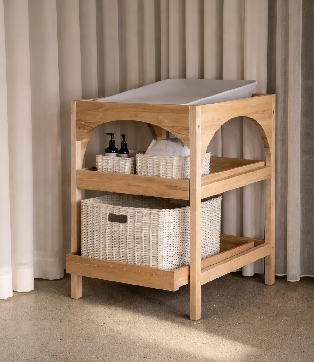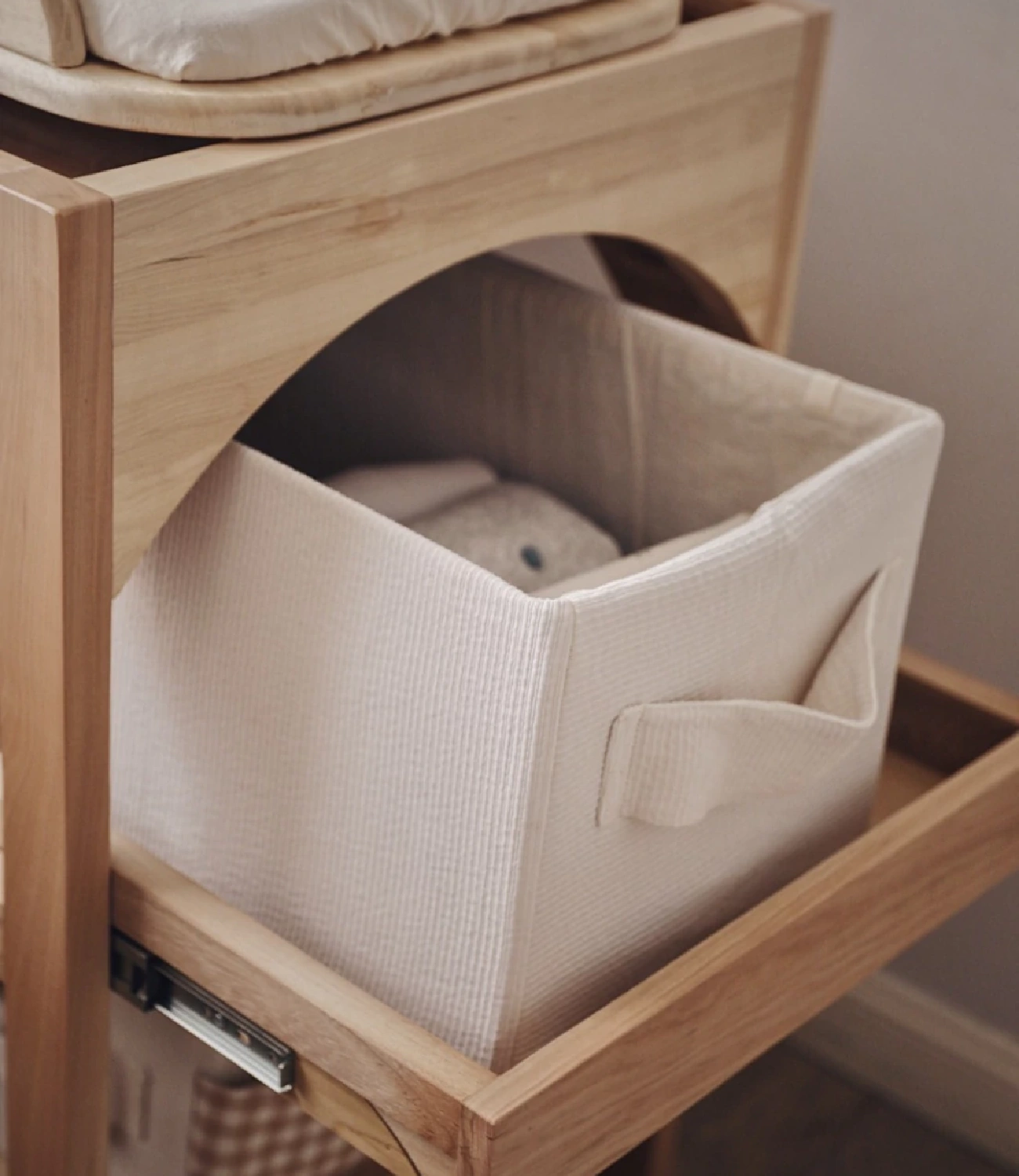 Cambiador Nube fabricado artesanalmente en roble acabado natural mate de la madera, cajones con rieles. No incluye accesorios ni elementos decorativos.
