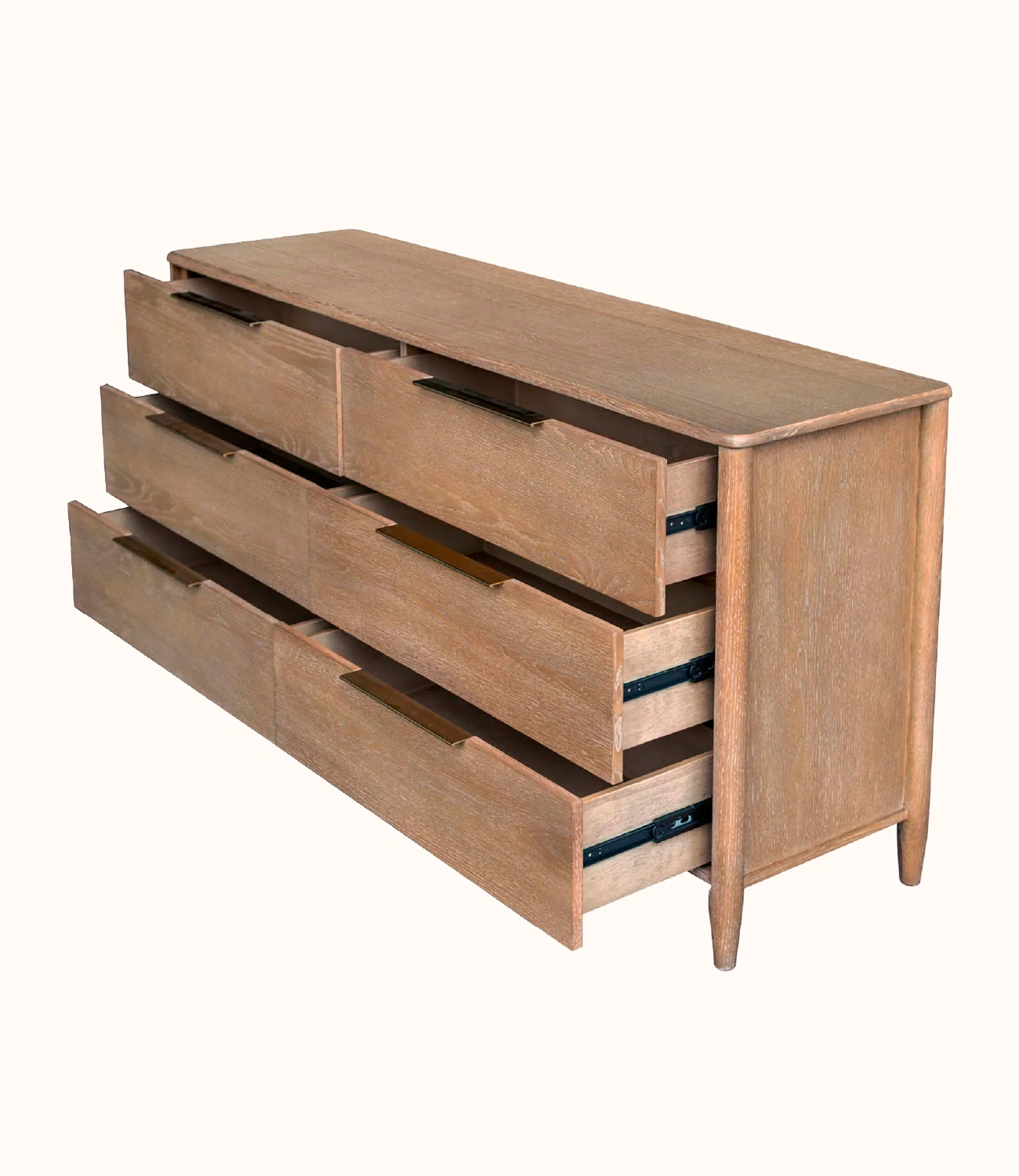 Cómoda Cielo fabricada artesanalmente en roble acabado natural mate de la madera, cuenta con 6 cajones con rieles y 2 cajones en los laterales. No incluye accesorios ni elementos decorativos.