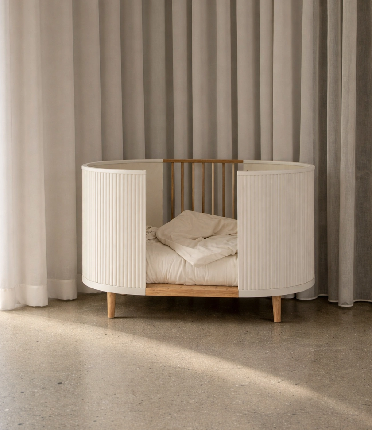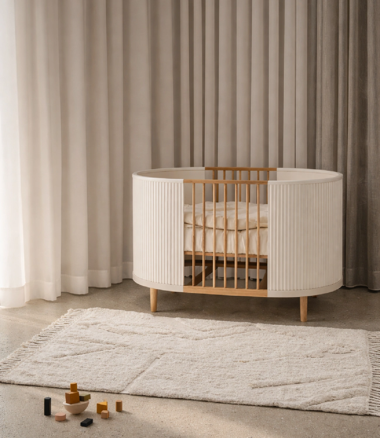 Cuna Tess fabricada artesanalmente en roble acabado mate, cuenta con 2 niveles de altura para la parte del colchón. No incluye accesorios ni elementos decorativos.