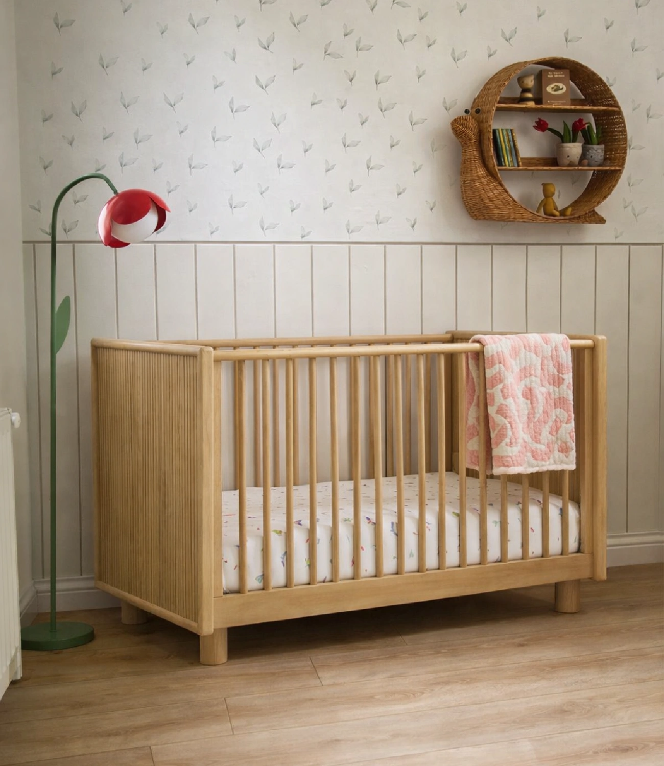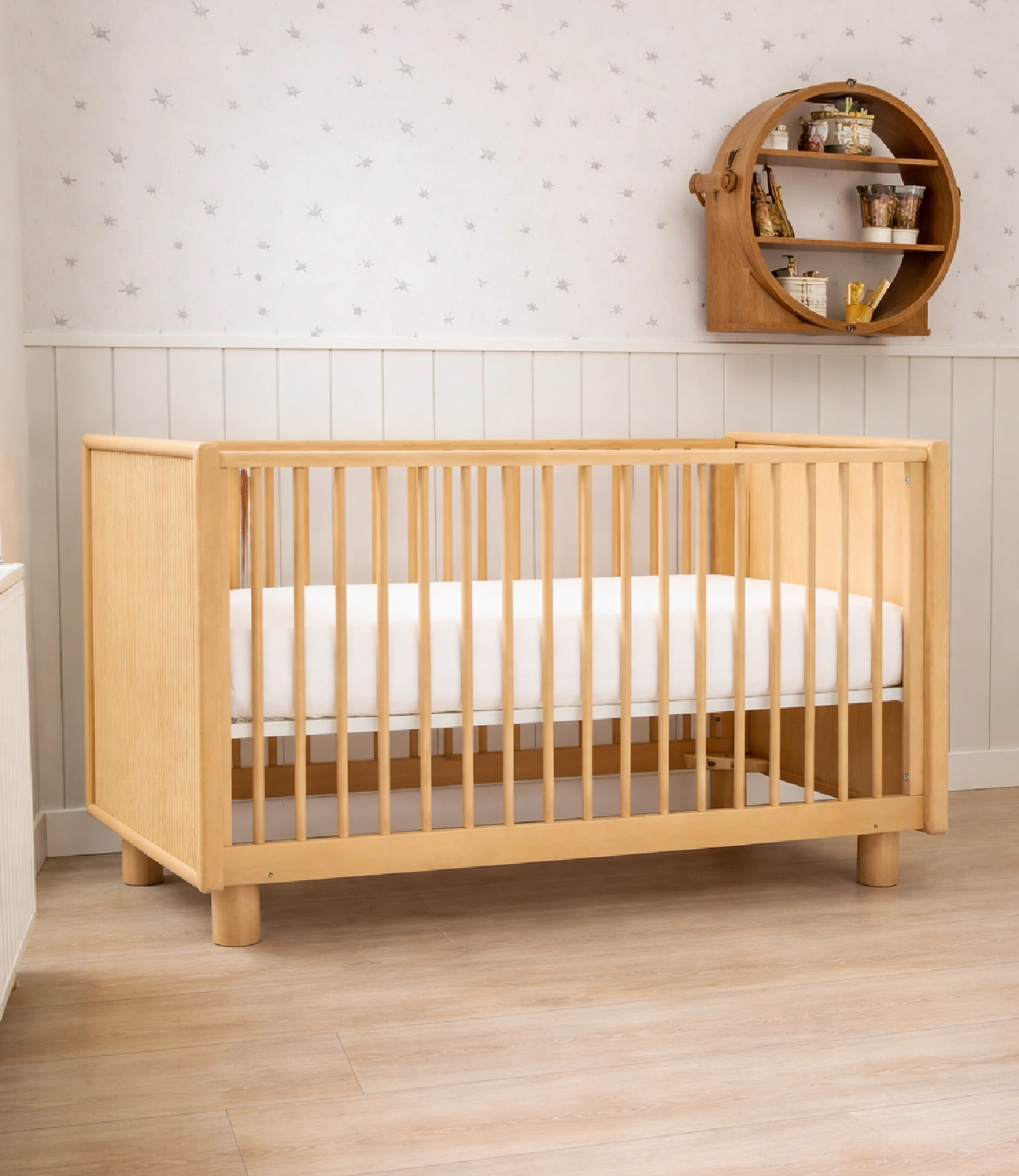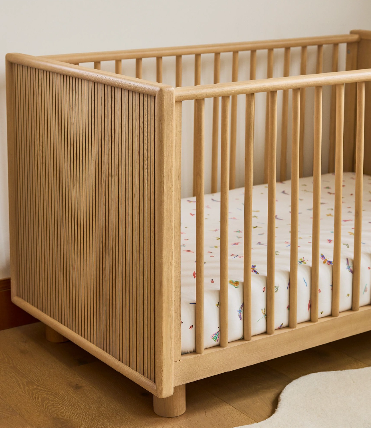 Cuna Tess fabricada artesanalmente en roble acabado mate, cuenta con 2 niveles de altura para la parte del colchón. No incluye accesorios ni elementos decorativos.