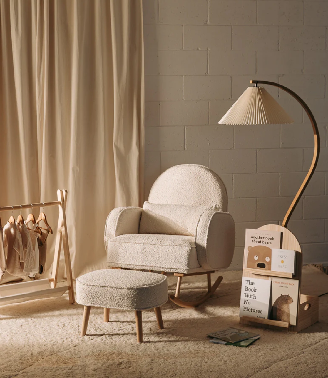 Mecedora Elena con apoyapies fabricada con estructura en roble y tapizado en tono de preferencia. No incluye accesorios ni elementos decorativos.