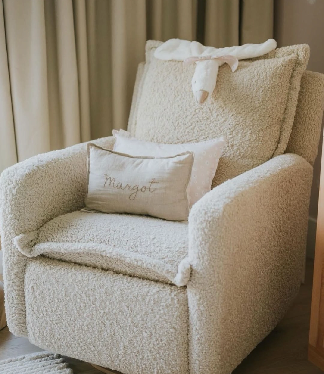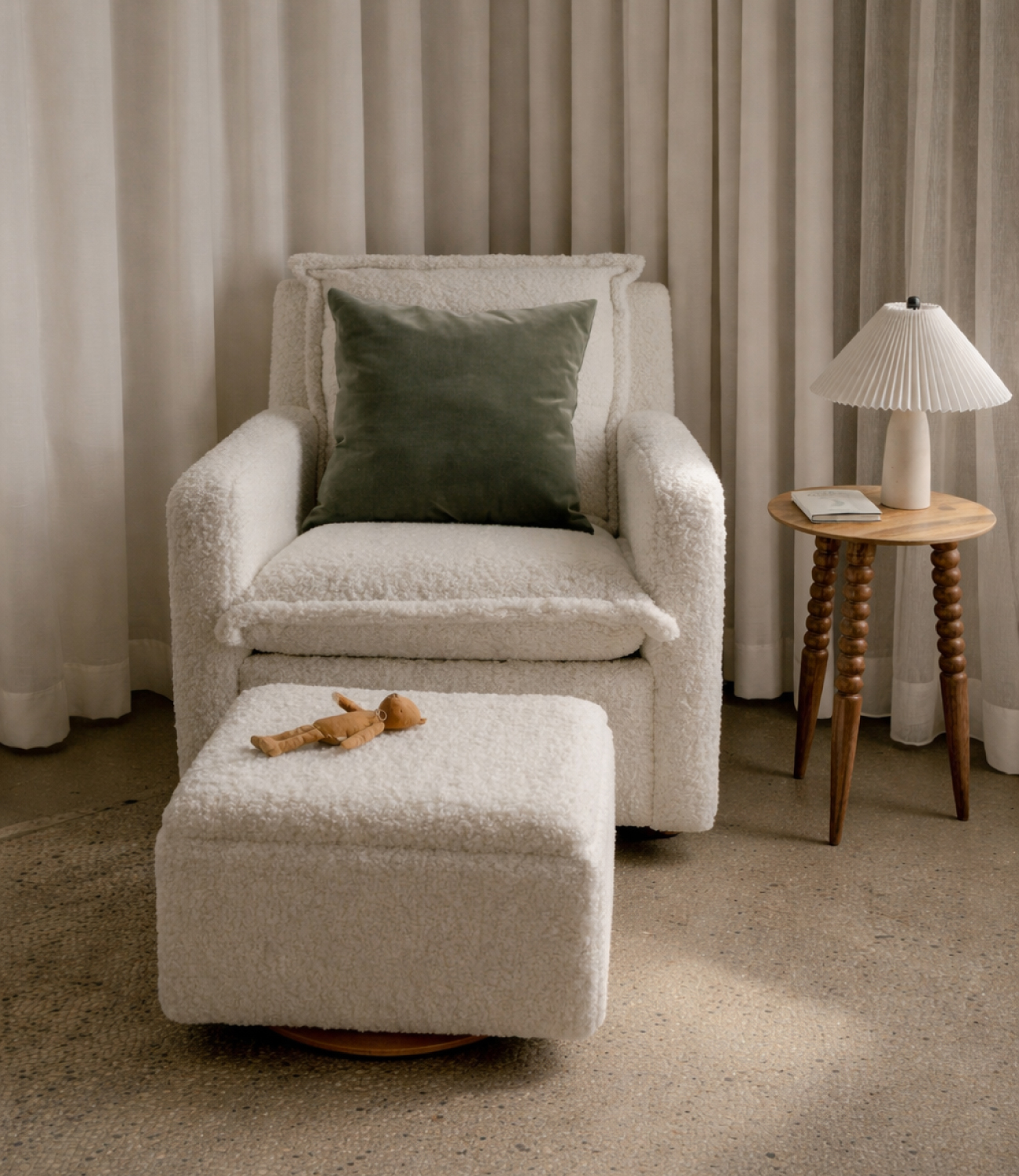 Mecedora Alma con apoyapies fabricada con estructura interna en cedro/triplex y tapizado en tono de preferencia. No incluye accesorios ni elementos decorativos.