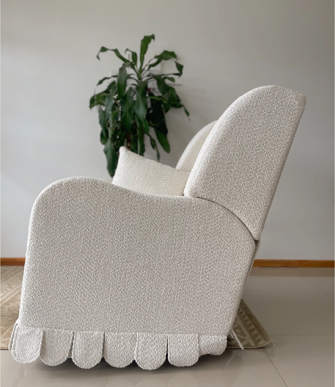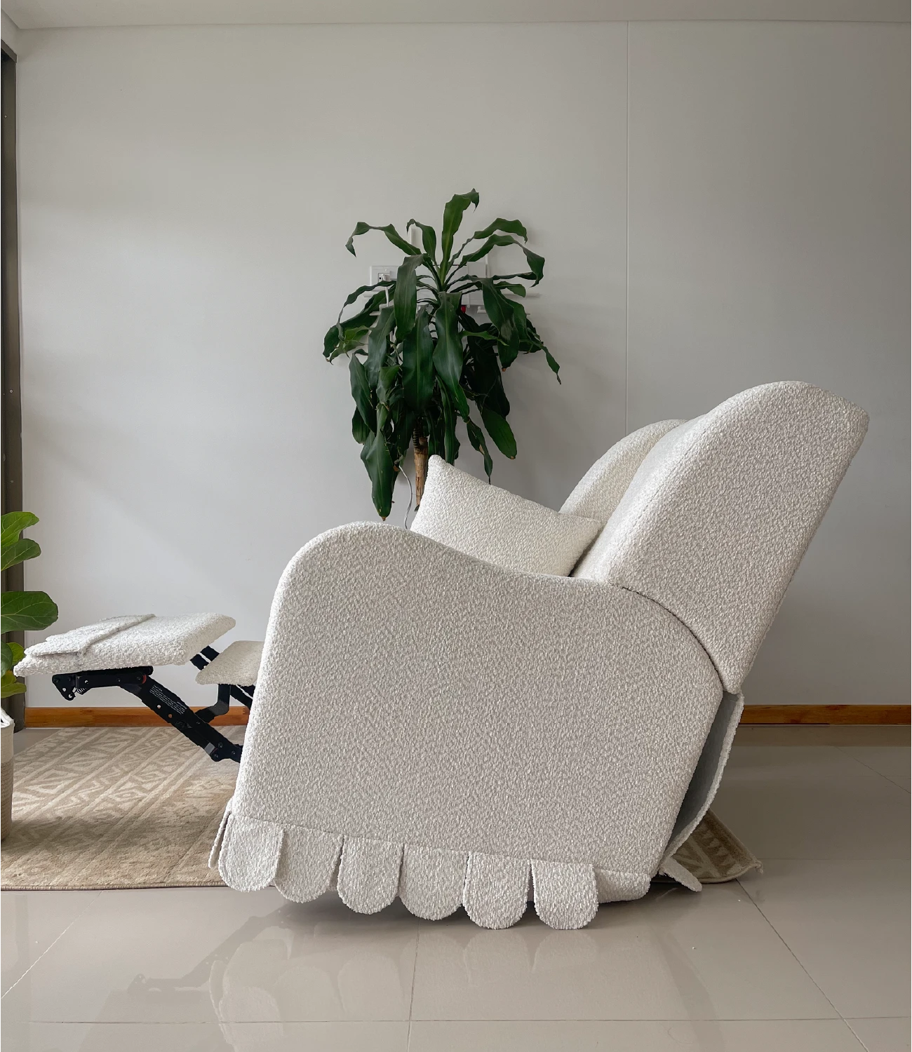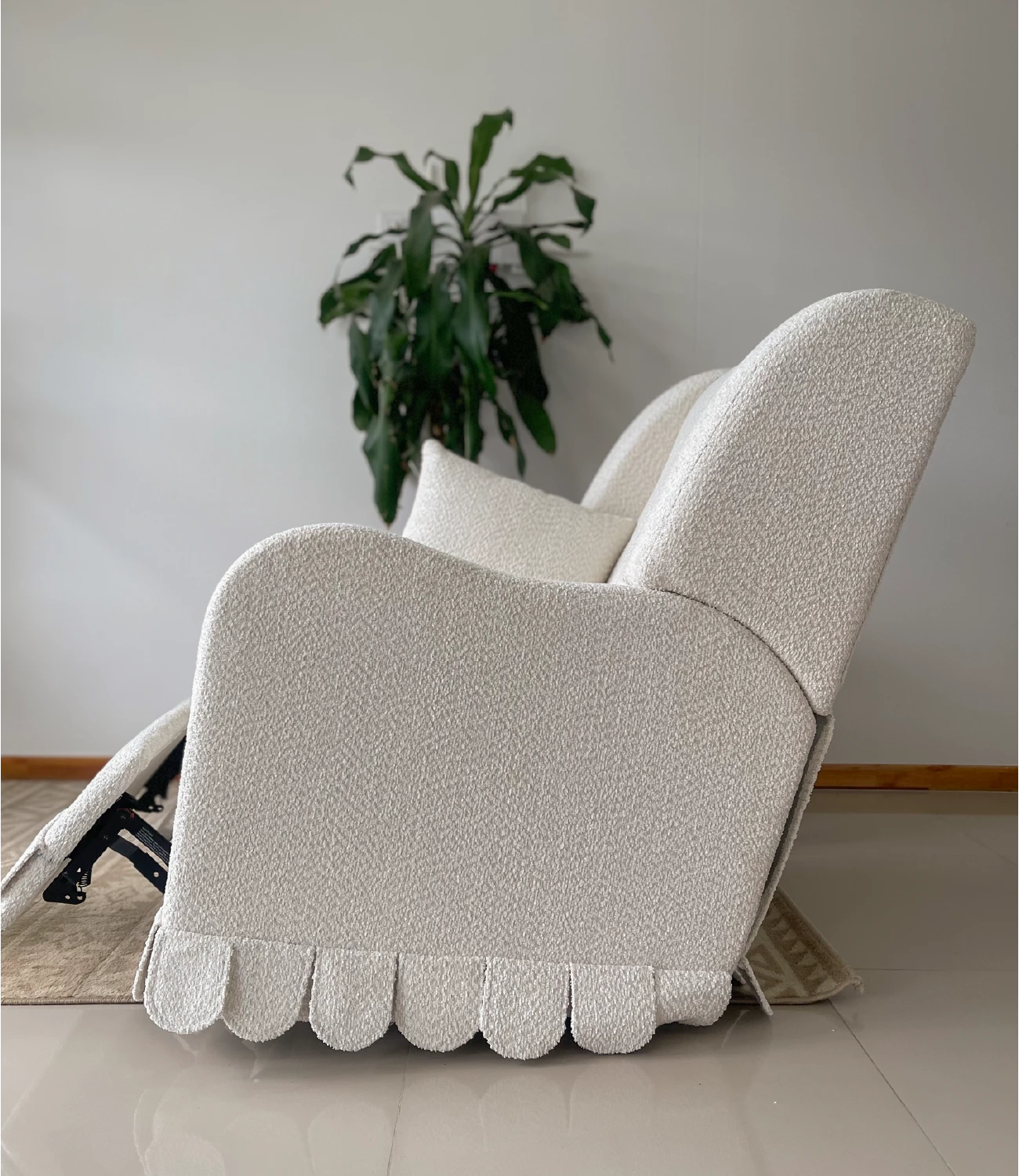 Nuestra mecedora Luna eléctrica está diseñada para acompañarte en cada momento, cuenta con sistema eléctrico para un movimiento suave y continuo, función giratoria, reclinación ajustable y detalles funcionales como velcro posterior que facilita su ajuste y acabado, podrás tapizarla en el tono de preferencia. No incluye accesorios ni elementos decorativos.