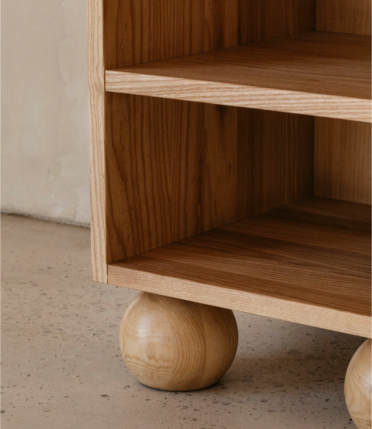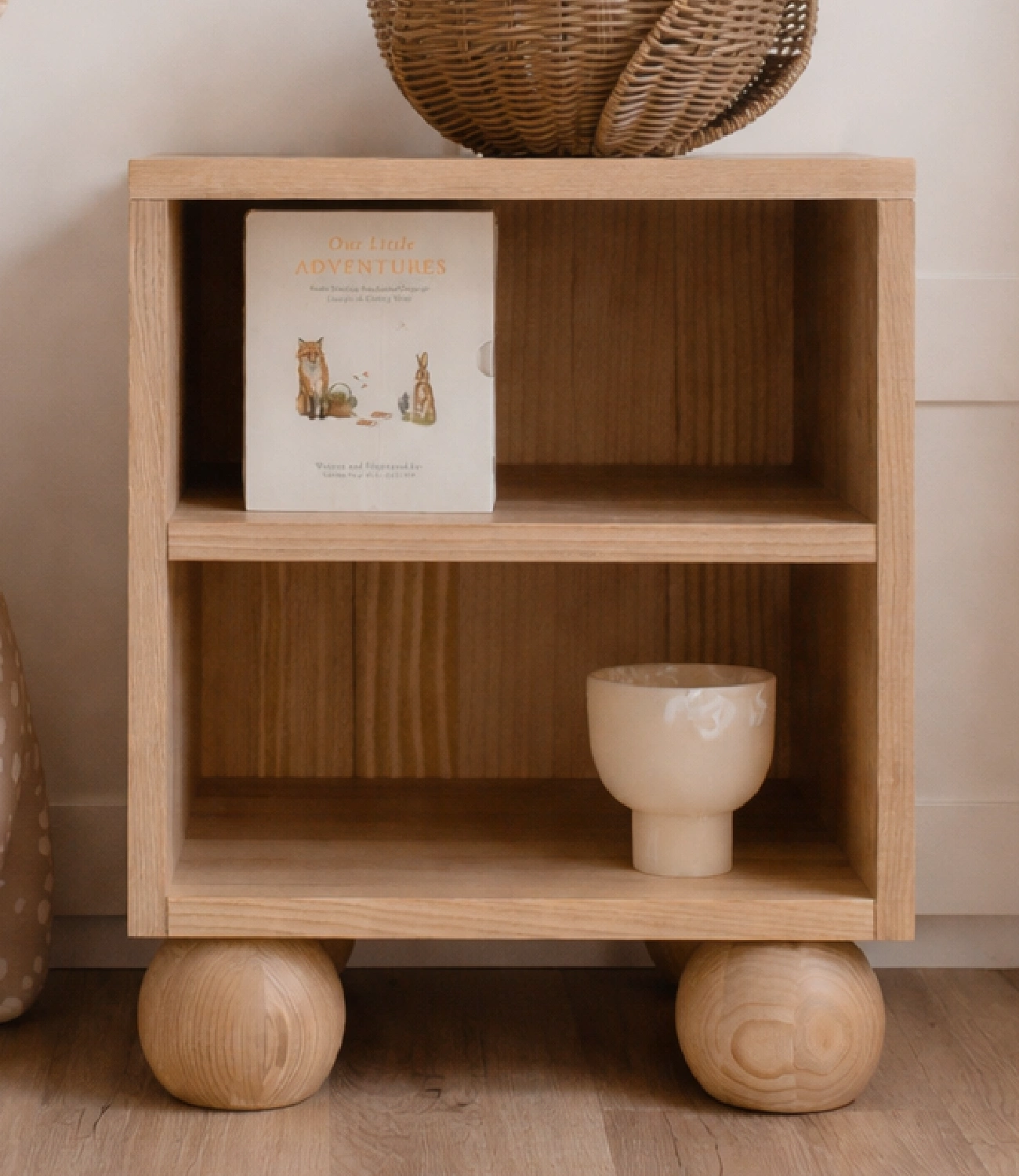 Mesa de noche Coco fabricada artesanalmente en roble macizo tonalidad natural mate. No incluye accesorios ni elementos decorativos.