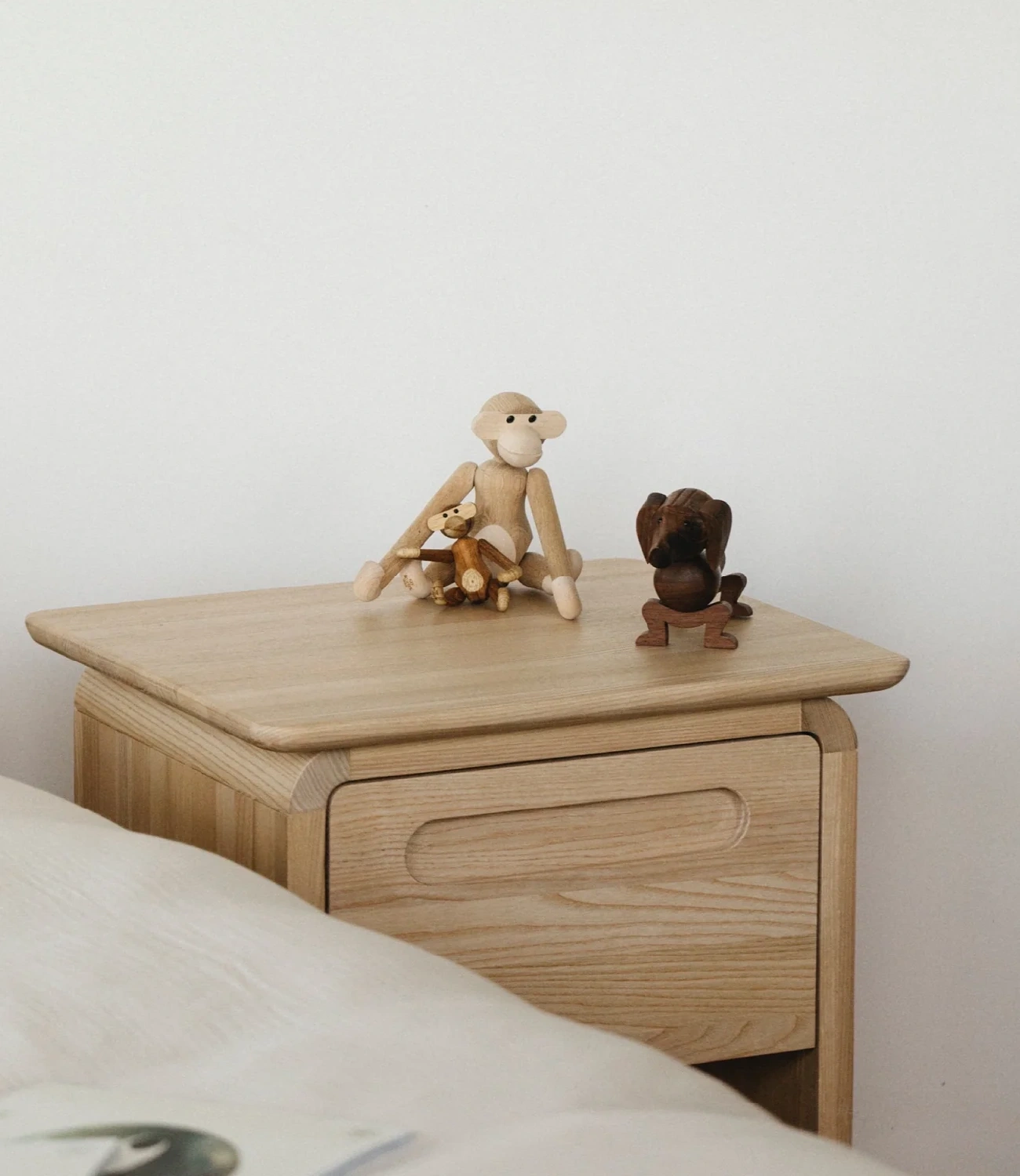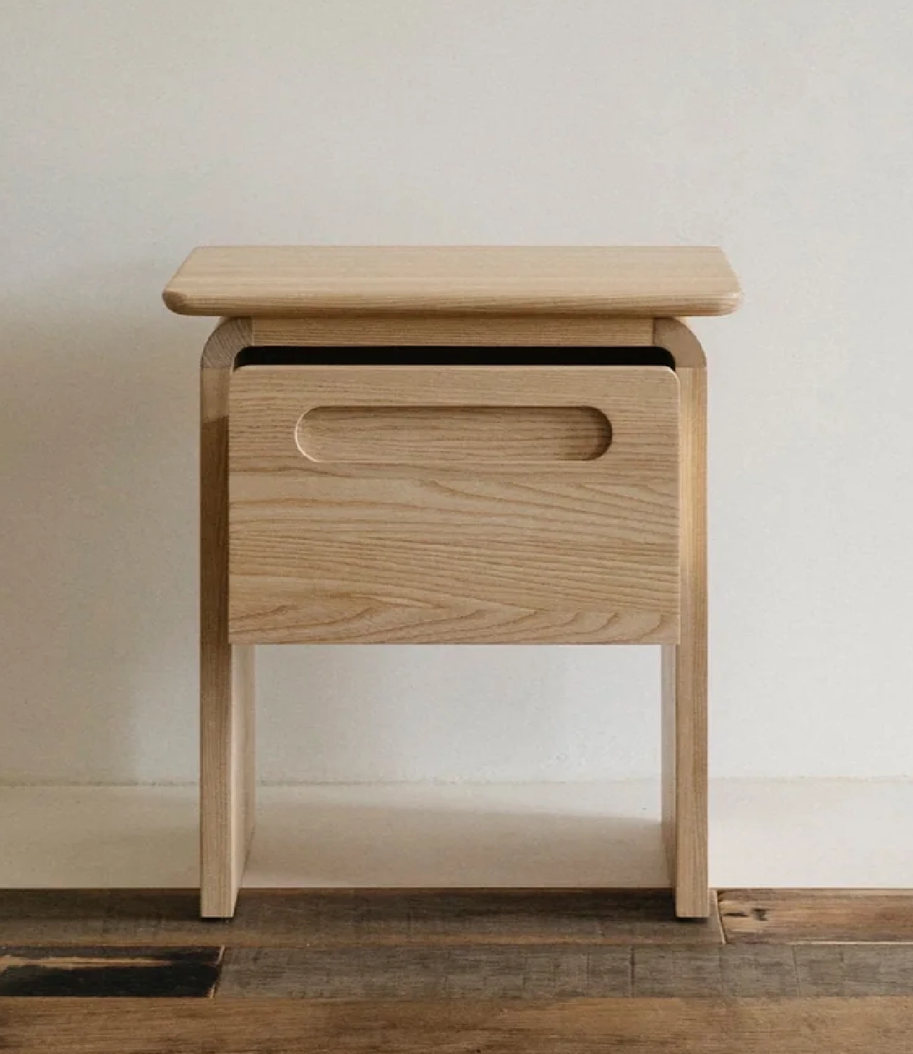 Mesa de noche Violeta fabricada artesanalmente en roble macizo tonalidad natural mate. No incluye accesorios ni elementos decorativos.